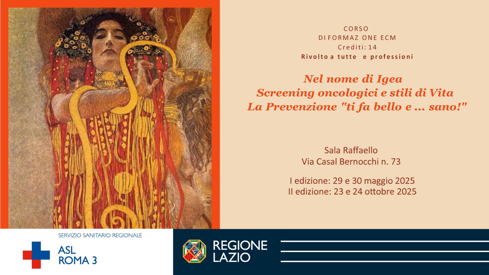 Nel nome di Igea. Screening oncologici e stili di vita. “La prevenzione ti fa bello e sano!”. Questo il tema del corso di formazione organizzato dalla ASL Roma 3 e che si terrà il 23 e 24 ottobre 2025 (dalle 8 alle