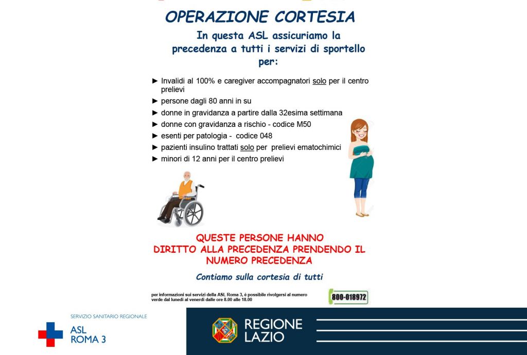 “Operazione Cortesia” è l’iniziativa con la quale la ASL Roma 3 tutela ulteriormente le necessità degli utenti con particolari condizioni fisiche e di salute garantendo loro la priorità nell’accesso agli sportelli dei servizi aziendali. Un gesto utile a migliorare la qualità del rapporto con gentilezza e cura.
