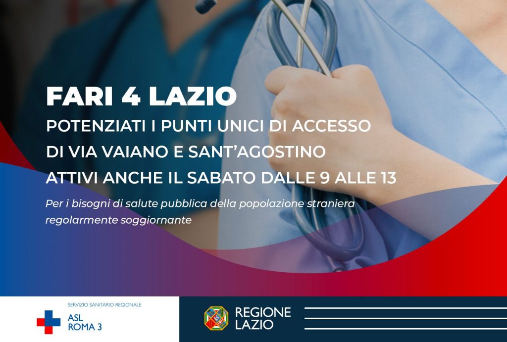 La ASL Roma 3 in qualità di partner del Progetto FARI4Lazio, cofinanziato dalla Unione Europea, ha potenziato l’offerta dei Punti Unici di Accesso il sabato dalle ore 9 alle ore 13 presso la Casa della Comunità di Via Vaiano e la Casa della Comunità Sant’Agostino, con l’obiettivo di fornire risposte efficaci e tempestive ai bisogni di salute fisica e mentale della popolazione straniera regolarmente soggiornante, e in particolare ai soggetti richiedenti o titolari di protezione internazionale in condizioni di vulnerabilità e di minori stranieri non comunitari.