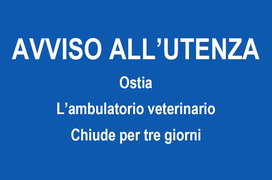 Si comunica che l’Ambulatorio Veterinario di Via Antonio Forni, 39 di Ostia rimarrà chiuso per motivi ambientali nelle giornate del 29,30 e 31 Dicembre 2025.